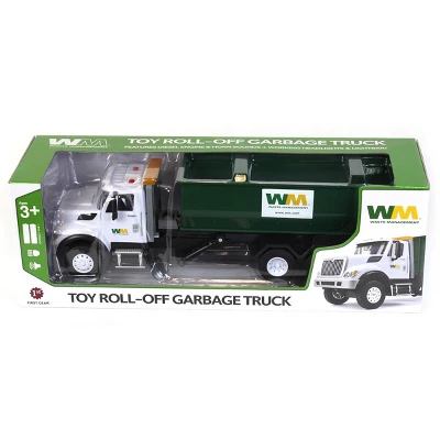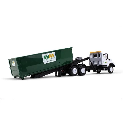 First Gear 1/24 scale Plastic Toy Waste Management International WorkStar with Roll-off Container features working lights and sound activation buttons; working reel and cable hook; removable roll-off container that slides and tilts on the frame; includes two AA batteries. Measures 15.75″L x 4″W x 4.75″H. Recommended for ages 3 and over