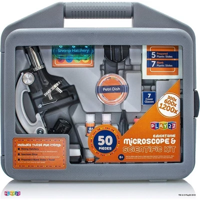 The Microscope Kit Set from Play22usa includes a microscope, slides (5 prepared plastic slides and 7 blank prepared plastic slides), slide covers (7 Slide labels and 7 slide covers), 7 cover glasses slips, brine shrimp egg, gum media dye, eosin dye, sea salt, shrimp hatchery, micro slicer, petri dish, tweezers, 12/13 specimen vials, test tube, stir bar, dissection needle, scalpel and spare light bulb. It also comes with a built-in rotating color filter wheel 300X 600X 1200X magnification, LED lighting and mirror illumination, 3 AA batteries required (batteries not included), anti-slip rubber bottom, and durable metal construction frame with stage and clips. This kit comes with a hard-shell case for storage and an easy instruction guide. This student microscope meets all safety requirements.