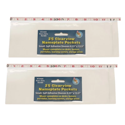 These Ashley Productions Clear View Self-Adhesive pockets seal at the end and remove easily from desks. Self-adhesive and heavy duty. Open pocket, slip in nameplate, remove backing, position pocket and stick! Each pocket measures 4-1/4″” tall by 12-1/2″” wide. Each pack includes 25 pockets. Sold as 2 packs for a total of 50 pockets. Available in Extra Small, Small and Large.