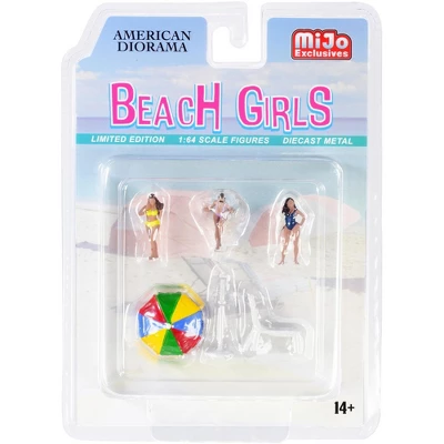 Brand new 1/64 scale diecast models of “Beach Girls” 5 piece Diecast Set (3 Figurines, 1 Beach Chaise and 1 Beach Umbrella) for 1/64 scale models by American Diorama.Limited edition.Brand new box.Made of die-cast metal.Comes in a blister pack.Does not come with the car shown.Each figurine is approximately 0.5-1 inches tall.Only 3 figurines, 1 beach chaise and 1 beach umbrella will be received.