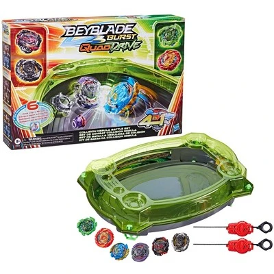 - EVERYTHING NEEDED TO BATTLE: Includes QuadDrive Collision Nebula Beystadium, 2 right/left-spin launchers, and 6 spinning tops. Scan codes to unlock tops in the Beyblade Burst app at the max: Level 5. Compete in Beyblade Burst app to unleash tops in virtual battles with Bladers worldwide!