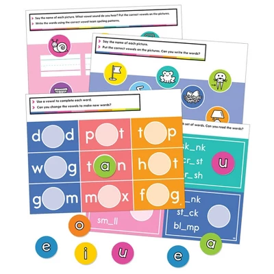 Carson Dellosa Education Edu-Clings Silicone Center: Vowels | The Edu-Clings Silicone Center: Vowels will support students as they work with foundational reading and decoding skills such as identifying words with the same vowel sound and making rhyming words. This easy-to-clean, 20-piece resource provides a revolutionary hands-on learning experience for both at home or in the classroom. Each dry-erase mat measures 8.5 inches x 11 inches, with each manipulative measuring approximately 1.97 inches in diameter.Edu-Clings are the perfect hands-on learning manipulatives. They encourage discovery and deeper understanding at home and in the classroom. The innovative silicone material is easy to clean, quiet, durable, and clings to all nonporous surfaces without leaving any residue. It’s dishwasher safe so you can sanitize regularly and easily. You can even write on it with dry-erase markers! Warm water and a touch of dish soap will always make it cling like new. From individual center activities to larger manipulatives that are perfect for whiteboards, Edu-Clings will revolutionize hands-on learning at home and in the classroom.