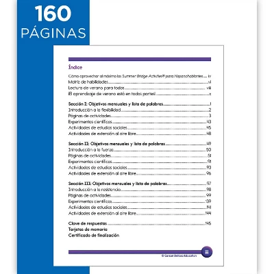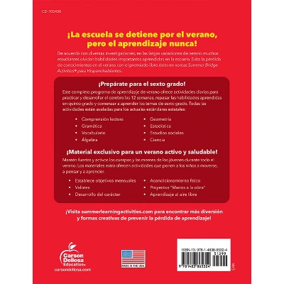 Prevent summer learning loss and prepare your child for back-to-school success in just 15 minutes a day with engaging activities, exercises, fun games, and more � all in one workbook with Summer Bridge Activities Spanish Workbook! This Spanish book helps Spanish-speaking fifth – sixth graders keep their skills sharp while learning English during the summer months to stop summer slide through fun practice pages and activities, covering math, science, reading, writing, social studies, fitness, and more. Students practice grammar, writing skills, fractions, solving equations, geography, science experiments, and other engaging topics, with both activities and directions in Spanish. This Spanish workbook for kids includes flash cards and a completion certificate, and features a skill matrix and answer key to track student progress. Each page is numbered by day so kids and parents can track progress and reach monthly learning goals.