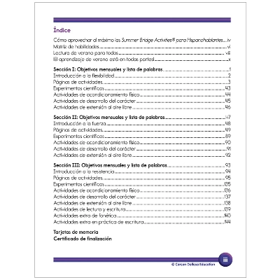 Prevent summer learning loss and prepare your child for back-to-school success in just 15 minutes a day with engaging activities, exercises, fun games, and more that help teach Spanish-speakers English � all in one workbook with Summer Bridge Activities Spanish Workbook! This Spanish book helps preschoolers – kindergarteners keep their skills sharp while learning English during the summer months to stop summer slide through fun practice pages and activities, covering math, science, reading, writing, social studies, fitness, and more. Students practice phonics, handwriting, counting numbers, hands-on science experiments, and other engaging topics, with both activities and directions in Spanish. This Spanish workbook for kids includes flash cards, stickers, and a completion certificate, and features a skill matrix and answer key to track student progress. Each page is numbered by day so kids and parents can track progress and reach monthly learning goals.