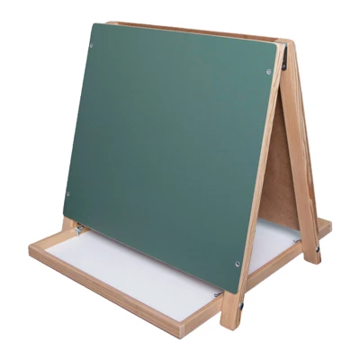 - This easel features a white dry-erase surface on one side and a green chalkboard on the reverse
