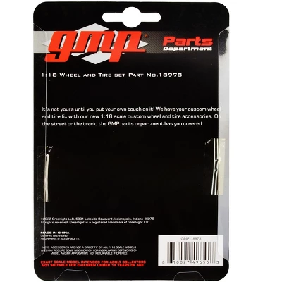 Brand new 1/18 scale models of Custom SVT 7-Spoke Wheel & Tire Set of 4 pieces from “1990 Ford Mustang 5.0 Custom” by GMP.Brand new box.Real rubber tires.True-to-scale detail.Officially licensed product.Pre-finished detailed accessory.Does not come with the car shown.Diameter approximately: 1.375 inches.Manufacturer’s original unopened packaging.PLEASE NOTE: accessories are not a direct fit on all 1/18 scale models and may require some modification for installation depending on model and/or application.