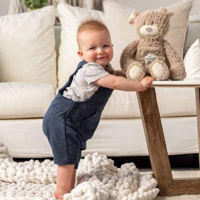 - Textures provide sensory experiences to promote happy and engaged babies; Embroidered bear nose and eyes show this stuffed toy as a loyal companion