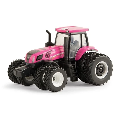 Made by ERTL, this pink 1/64 New Holland Genesis T8.410 tractor is a great edition to any farm replica! The New Holland tractor features clear cab windows, front and rear dual wheels, pin hitch and a pink color scheme. The tractor is made from diecast metal with some plastic parts and rubber wheels. Per the manufacture the New Holland tractor is recommended for ages 3+ years and up.