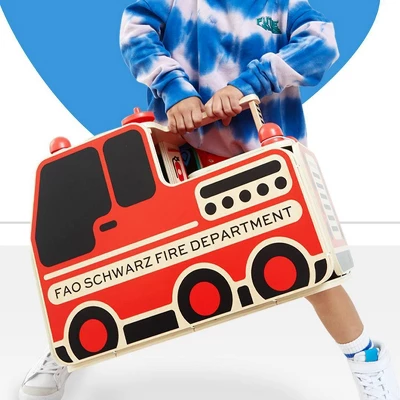 Save the day with the Rescue Responders from FAO Schwarz. The wooden playset begins as a classic fire engine before transforming into a multi-level fire department. This action-packed set features working gears, hidden surprises, and push-play vehicles that are sure to keep your child’s imagination engaged and stimulated. The complete 21-piece set neatly packs up into the firetruck for easy cleanup and storage making this the perfect toy for on-the-go play.