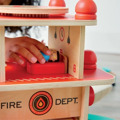 - 21-piece fire station includes working gears, hidden surprises, 3 push-play vehicles and characters you can use anywhere