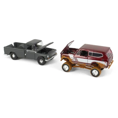 Johnny Lightning presents Off Road Trucks series featuring 2 International vehicles. This 1/64th set includes a 1965 International 1200 truck and 1979 International Scout. The set is made from diecast metal with detailed plastic and rubber wheels. Features clear cab windows, opening hoods, and the tailgate on the truck opens. This item is recommended from the manufacturer for ages 6+ years and up