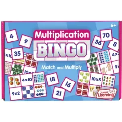 Junior Learning Multiplication Bingo is a matching game for teaching multiplication. Contains four (4) boards and twenty-four (24) cards. A perfect addition to any classroom, home-school or childcare facility. Colorful, bold images used throughout. Match and Multiply! Teacher/student learning or play with friends. Hands on and fun! Ages 6+ years. Chipboard construction.