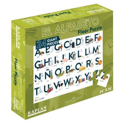 Learn the Spanish alphabet with our 24-piece floor puzzle featuring people, animals, and objects. Puzzle shows letters, actual photographs, and words in Spanish. Made of extra-thick, durable cardboard with a wipe-clean surface. Measures 36″ x 24″.