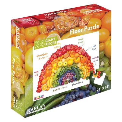 Recognize color words in Spanish with real photographs of fruits and vegetables. Each color is represented by a delicious fruit or vegetable. This 24-piece puzzle is made of extra-thick, durable cardboard with wipe-clean surface. Measures 24″ x 36″.