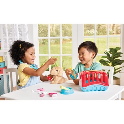- Product Specifications: Set includes a plush dog, pet carrier, stethoscope, syring, check-up card, brush, grooming scissors, nail clippers, food bowl & bone. Recommended for children ages 2+.