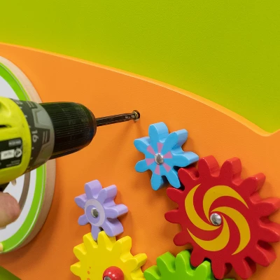 - TURN WALLS INTO A PLAYFUL FOREST – This wooden bear wall panel features a threading shape twister, ball maze, mirror and five interconnected spinning gears.
