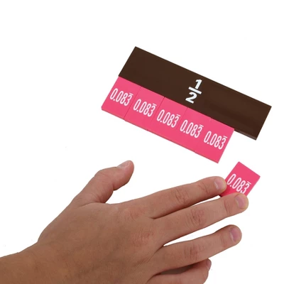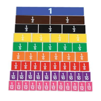 Learning Advantage Fraction/Decimal Tiles, Set of 51 | Color-coded tiles expand the learning of fractions and decimals. Double-sided tiles ease comparisons between fractions and decimals. Includes 51 double-sided pieces in 9 colors representing 1 (blue), 1/2 (brown), 1/3 (black), 1/4 (yellow), 1/5 (green), 1/6 (orange), 1/8 (red), 1/10 (purple), 1/12 (pink). Fractions printed one side / decimals on reverse. WARNING CHOKING HAZARD: Small Parts. Not for Children Under 3 yrs.