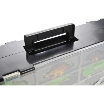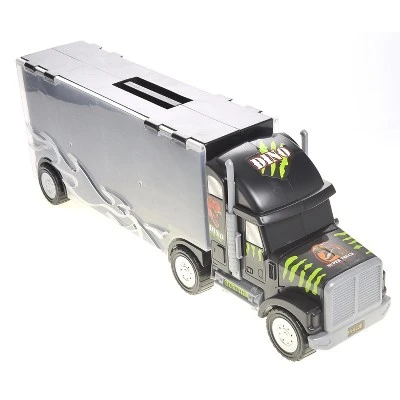Dinosaur Transport Truck with 13 Transportable pieces. This truck will bring your kids back to the age of the dinosaur. Have immense pretend play with 6 unique dinosaur pieces along with trees and other cars to set up! This set is easily carried with the handle on the top of the truck.