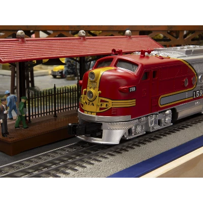 - Electric locomotive is modeled after the iconic Santa Fe Super Chief and pulls 2 coach and 1 observation car
