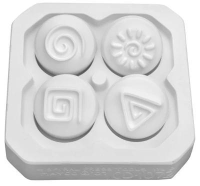Mayco Spiral Design Press Tools are used to stamp incised designs into plates, bowls, mugs, tiles and other clay shapes. Press tools measure 1-3/4 in diameter. 4 per set.