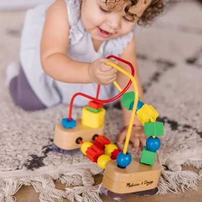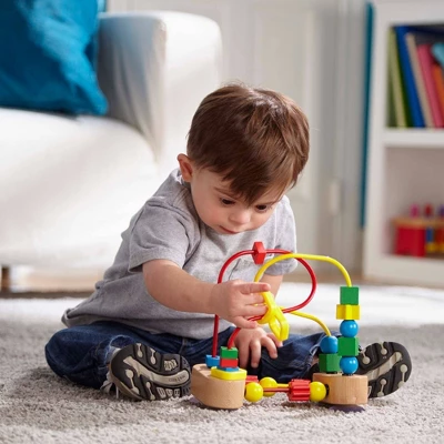 - Features 18 multi-shaped wooden beads and three plastic rings to spin and slide; encourages sensory skills, fine motor skills, and hand-eye coordination