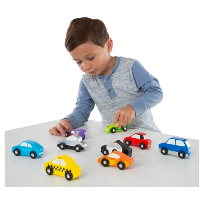 Race to the rescue, around the track, or all over town with these sturdy wooden cars! The nine-piece set includes cars, racecars, mini-van, police car, and taxi, each approximately four inches long. All are brightly colored, easy to identify, and fun for kids three and older to grasp and maneuver. Designed to play perfectly with Melissa & Doug Activity Rugs, the vehicles store conveniently or can be displayed in the compartmentalized wooden tray.