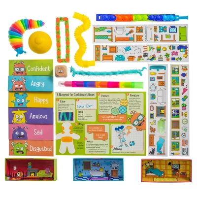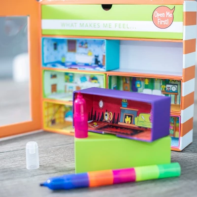 Discover, create, and celebrate the colorful spectrum of emotions with this brand-new craft that lets kids customize their very own feelings playhouse! Each drawer reveals an adorable emotion character (Anger, Happiness, Confidence, Disgust, Anxiety & Sadness) that invites children to explore and express the feeling while decorating a unique room to represent it. From customizing the rooms with vibrant colors and furniture stickers to answering thought-provoking questions, this interactive craft kit sparks creativity, fosters self-reflection, and promotes emotional intelligence while providing caregivers a fun opportunity to talk about their children’s feelings and experiences. Watch the beautiful and sturdy packaging transform into a custom playhouse your kids will want to play with again and again! As an added motivation, kids will be rewarded with a fun fidget surprise with each new feeling they explore!