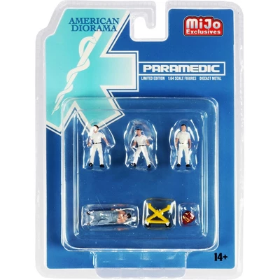 Brand new 1/64 scale diecast models of “Paramedic” 6 piece Diecast Set (4 Figurines and 2 Accessories) for 1/64 scale models by American Diorama.Limited edition.Brand new box.Made of die-cast metal.Comes in a blister pack.Does not come with car shown.Each figurine is approximately 1 inch tall.Only 4 figurines and 2 accessories will be received.