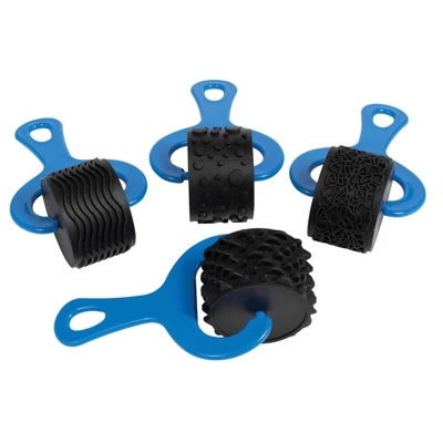 Ready 2 Learn Ready2Learn Heavy Duty Paint and Clay Explorer Rollers, 4 Per Set, 2 Sets | Here’s a super set of heavy duty rollers with 1 1/2″ wide unique, inventive and clever designs for use with paint or clay. The 4 designs are: 8-line wavy continuous pattern, small, medium and large dots in a random pattern, border pattern of lace-like squiggles, and 7-line dots, dashes and arcs in a continuous pattern. Each 5″ durable plastic, comfort-grip handle features a unique design molded in hard rubber on a sturdy roller. Rollers are easily cleaned allowing for child-safe, long term use. Each set includes 4 rollers. Sold as 2 sets for a total of 8 rollers.