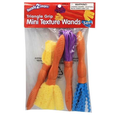 Ready 2 Learn Triangle Grip Mini Texture Wands, Set 1, Set of 4 | Paint fantastic art and promote tripod grip with Triangle Grip Mini Texture Wands. This set includes 4 paint brushes with rubber, triangular-shaped handles and 4 different tips: foam strips, crinkly sponge, chamois and gathered soft foam. Ideal for those with special needs, Triangle Grip Mini Texture Wands rest comfortably in small hands for greater artistic control. The triangle shape also promotes tripod writing grip. These paint brushes are durable for endless painting and creating. As children paint, they develop imagination, creative expression, hand-eye coordination and fine motor skills. The brushes come clean with warm soap and water, which makes them an ideal classroom accessory! For ages 3+. Size: 8″L.