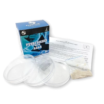 Discover the fun of microbiology with plastic Petri Dishes and Nutrient Agar. Nutrient Agar is used as a culture medium to cultivate various household bacteria. Detailed agar preparation instructions included. Three 90mm Petri dishes and one back of Nutrient Agar are packaged together. These Petri dishes are made of polystyrene and are sterilized. Ages 7+.
