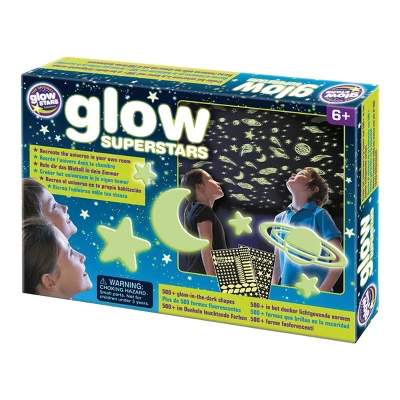Recreate the universe in your own room with the Glow Superstars 500+ Pieces! Set includes 150 plastic glow stickers of planets, stars, meteorites, glitter stars, and over 350 of the Original Paper Glowstars. Have fun decorating your bedroom and creating an amazing glow-in-the dark outer-space galaxy. In addition, they can also be used to accessories furniture, bags and books. All Glow Star products are ready to stick using high quality self-adhesive pads on the reverse side to stick the shapes on the ceiling, or all around the room.