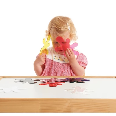 TickiT Splats, Set of 10 | Set of 10 acrylic paint splat shapes includes 6 primary and secondary colors (red, blue, yellow, green, orange, and purple), 1 clear and 3 opaque colors (black, white and double-sided mirror). Measures approximately 5.9″ diameter. Ideal for use on a light panel/illuminated surface for light and color exploration. Made from acrylic, these colored shapes are scratch-resistant and strong. They’re a great home or classroom resource for learning color! Unique shape for color mixing. The extended arms on these splat shapes are perfect for overlapping on each other to create new colors. A brilliant light panel accessory. Use the colorful, transparent splats to investigate light and color for an even better sensory experience! A fun way to learn colors and explore the world through a colored lens! Kids love holding these perfectly shaped pieces up to their eyes to see a different colored perspective.